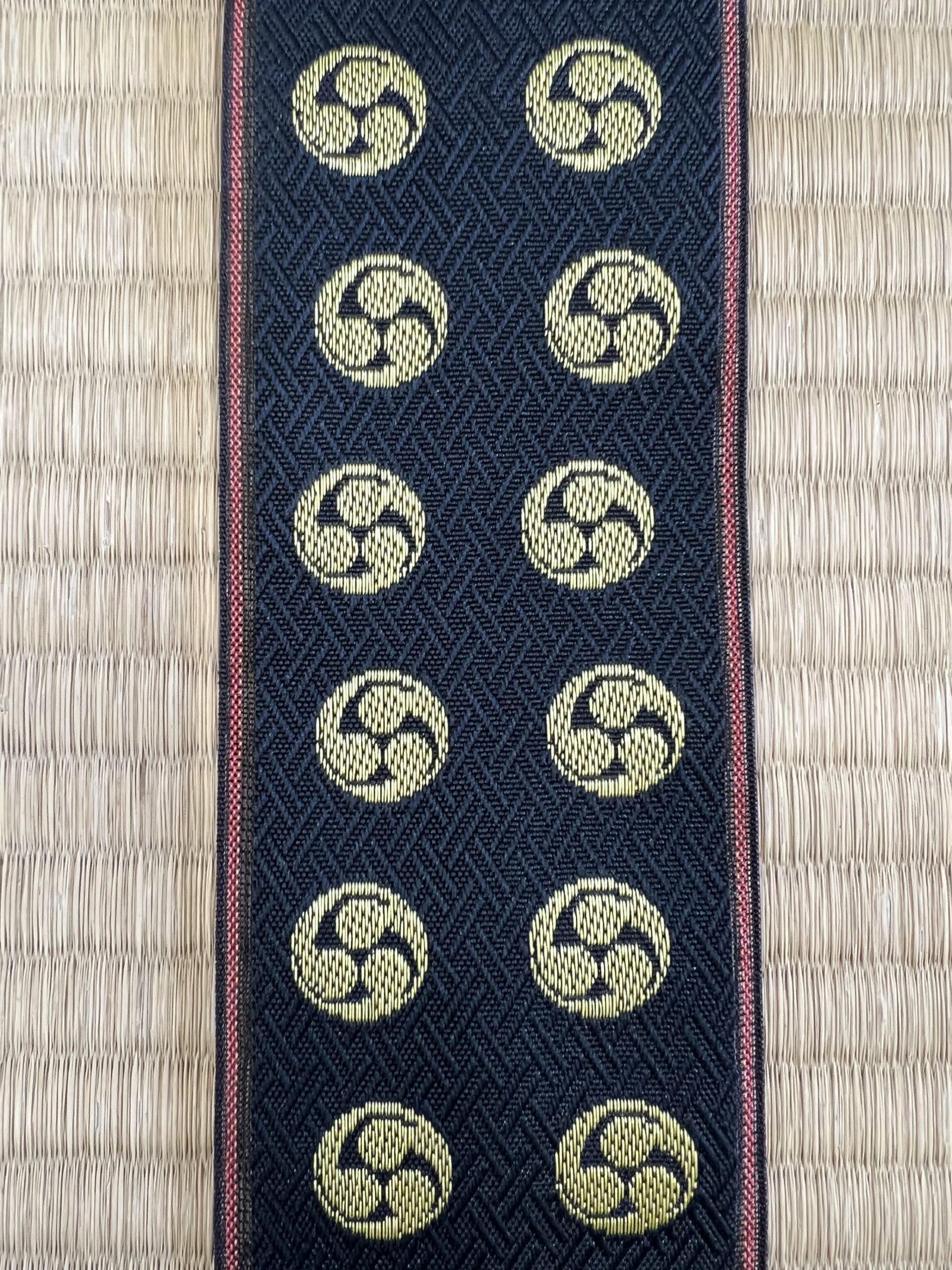 愛媛県西条市にある石岡神社さんの神紋である「三つ巴」の畳縁です。 愛媛県西条市では日本一のだんじり数を誇る西条祭りが有名で、石岡神社さんの氏子地域のだんじりには三つ巴があしらわれており親しまれている柄になります。 西条祭り好きな方に いつでも西条祭りの雰囲気を楽しんでいただけるように作製しました! 石岡神社さんには「三つ巴」畳縁を使用したミニ畳を奉納させていただきました。