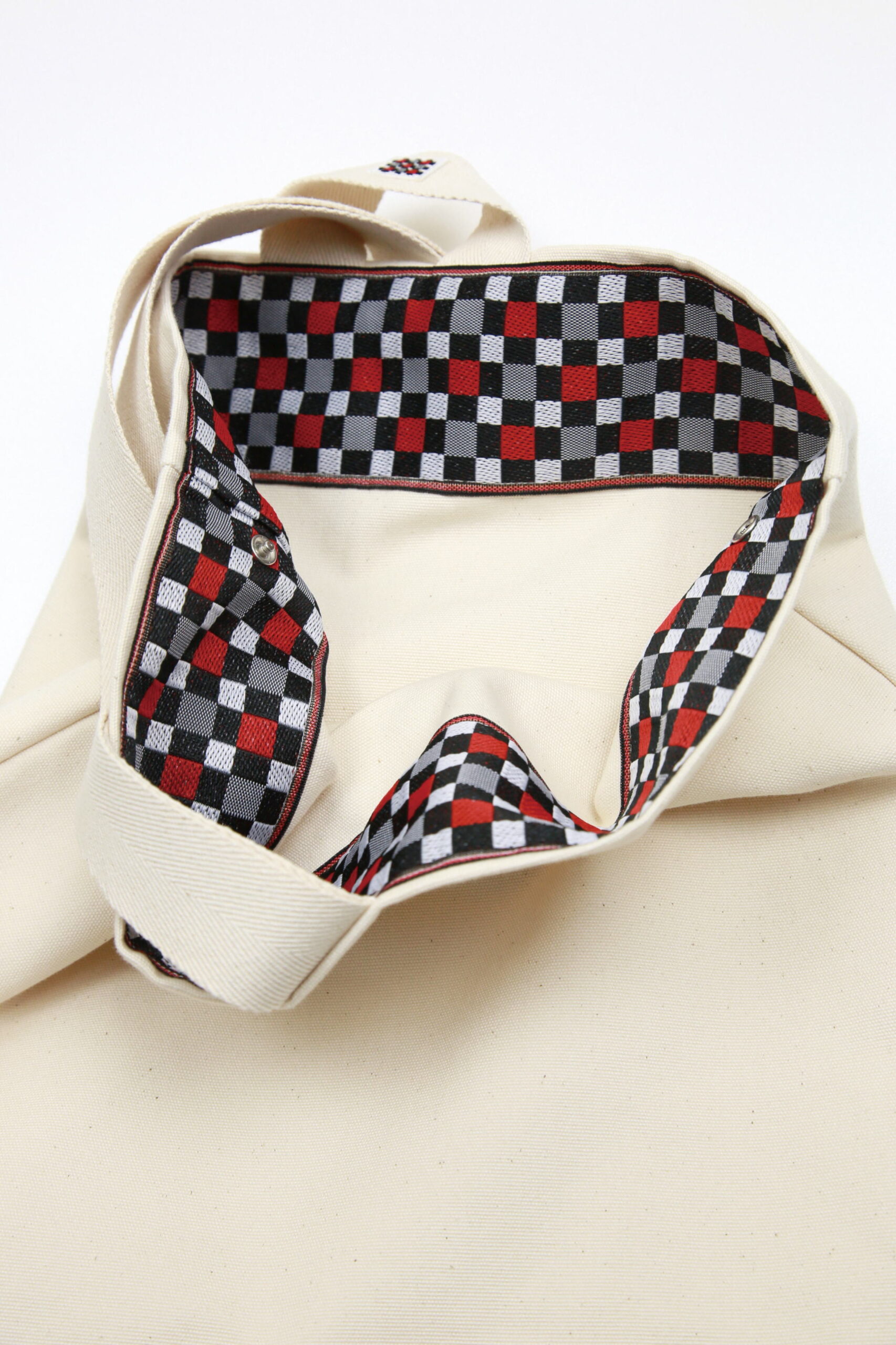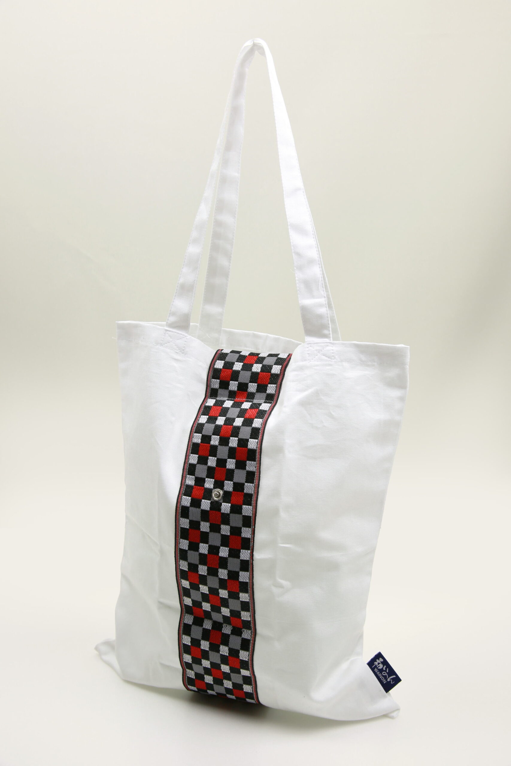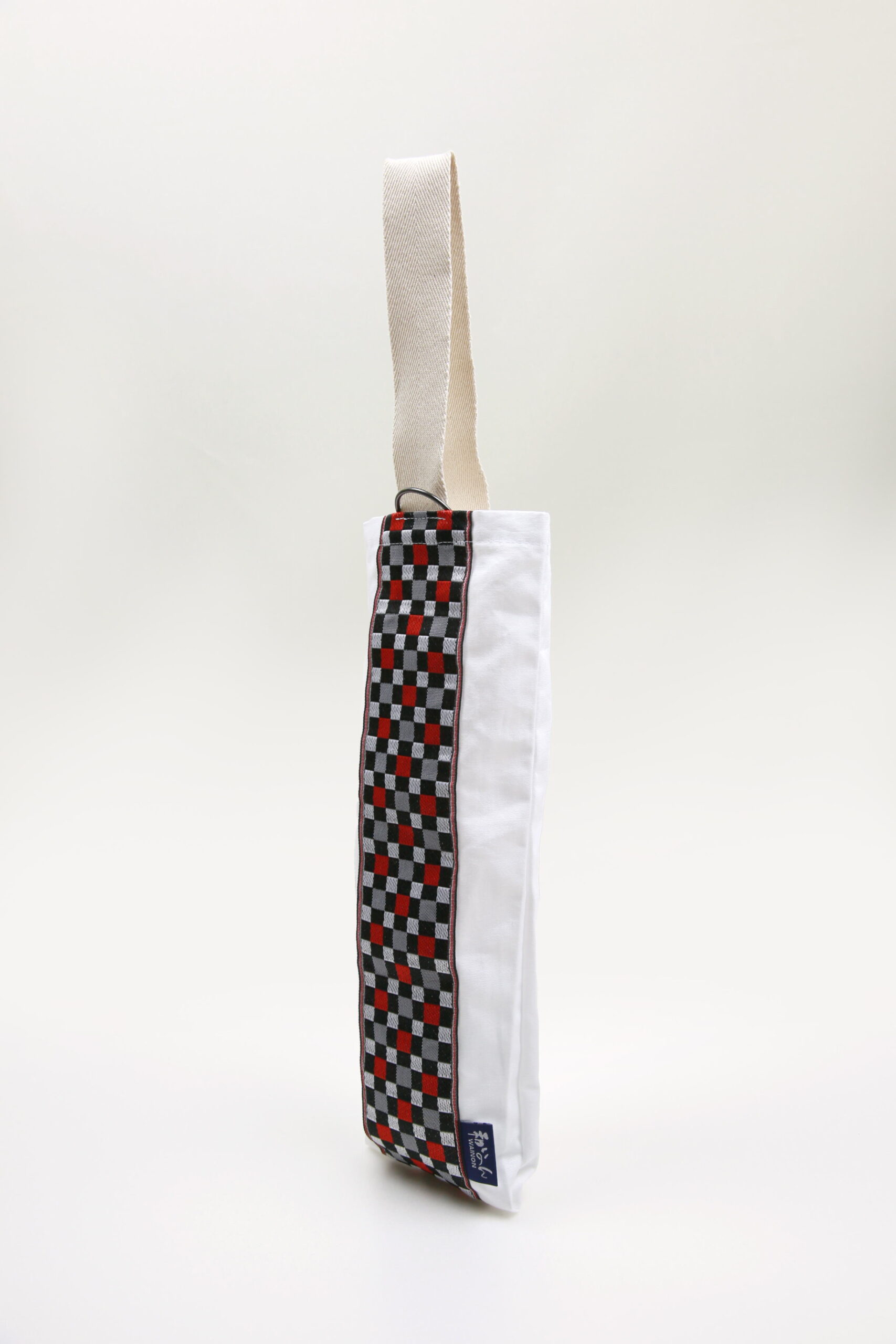 地域団体商標「和泉木綿」のロゴマークに使用されている、織物組織(平織)をイラストにしたデザインの畳縁です。経糸と緯糸からなる織物をモチーフにしたのシンプルなデザインと、白・黒・赤の原色使いのコントラストも相まって、幅広くお使いいただけると思っています。